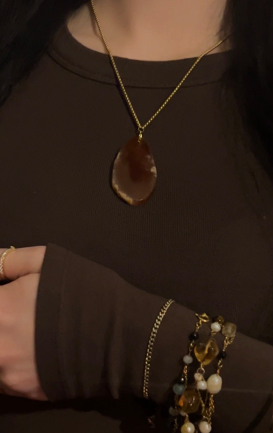 Autumn Chain to krótki łańcuszek z zawieszką z surowego plastra agatu brązowego który ma w sobie spokój, stabilność i cierpliwość. Kamień pomaga domknąć stare etapy i wejść w nowe z dojrzałą energią. Daje on uziemienie, stabilność, emocjonalne wyciszenie, ochronę energetyczną i poczucie bezpieczeństwa oraz wzmacnia skupienie i cierpliwość